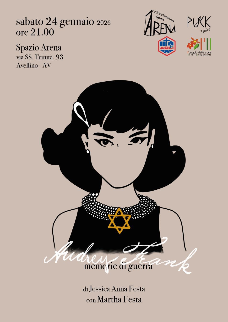 Pubblicato in - EVENTI - il 23 Gennaio 2026 Audrey Frank – Memorie di guerra Sabato 24/01/2026 ore 21.00 Per info e prenotazioni messaggio whatsapp al 3519561462 Condividi sui social
